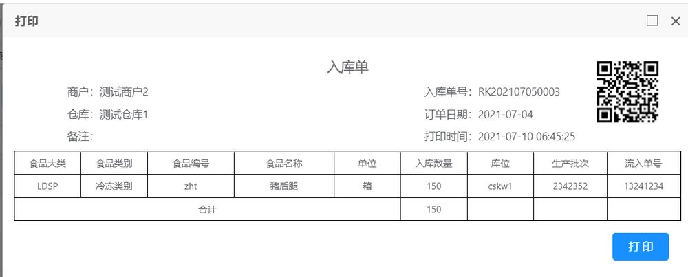 選擇要打印的入庫單,點擊【打印入庫單】按鈕,進入入庫單預覽界面,打印。