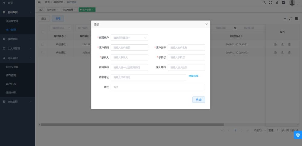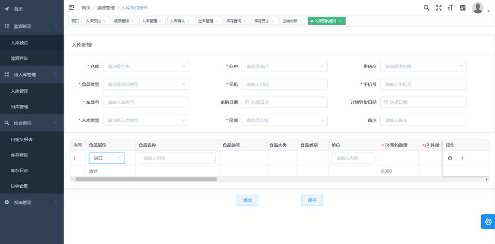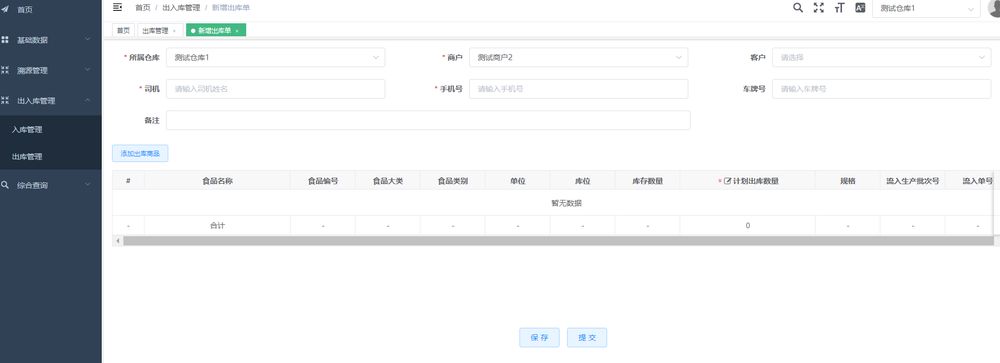點擊【入庫】按鈕,選擇商品所屬倉庫、商戶名稱、客戶、司機、司機聯系方式、車牌号,添加要入庫的商品。點擊【提交】按鈕,提交成功,商品變爲待出庫狀态。