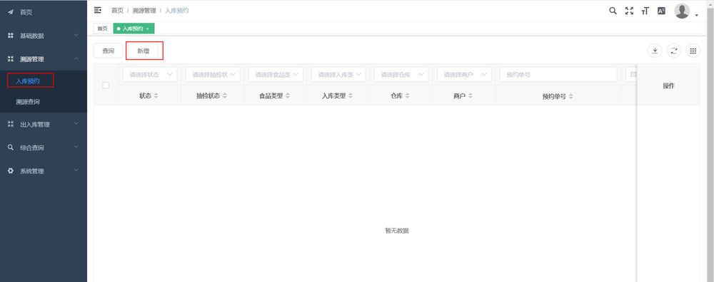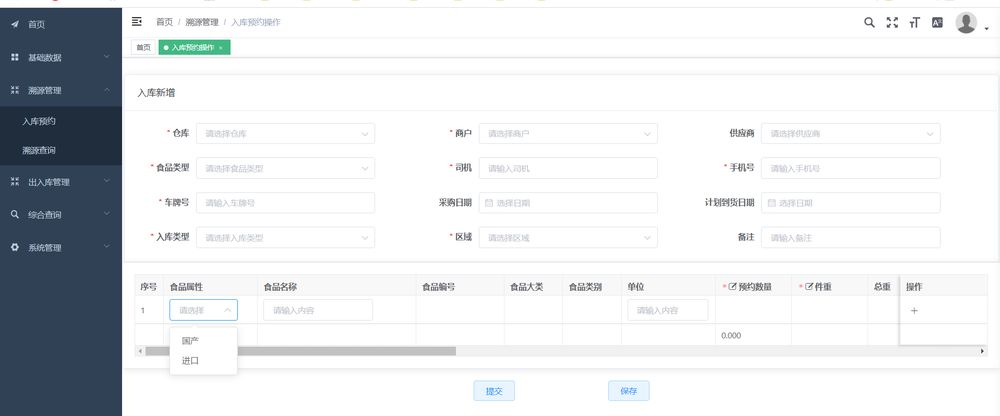 點擊【新增】按鈕,選擇倉庫信息、填寫運輸信息、填寫商品信息,根據商品進口/國産性質,上傳檢驗檢疫證書、報關單、核酸檢測報告、消殺證明等圖片,點擊提交,入庫預約進入園區審核階段。
