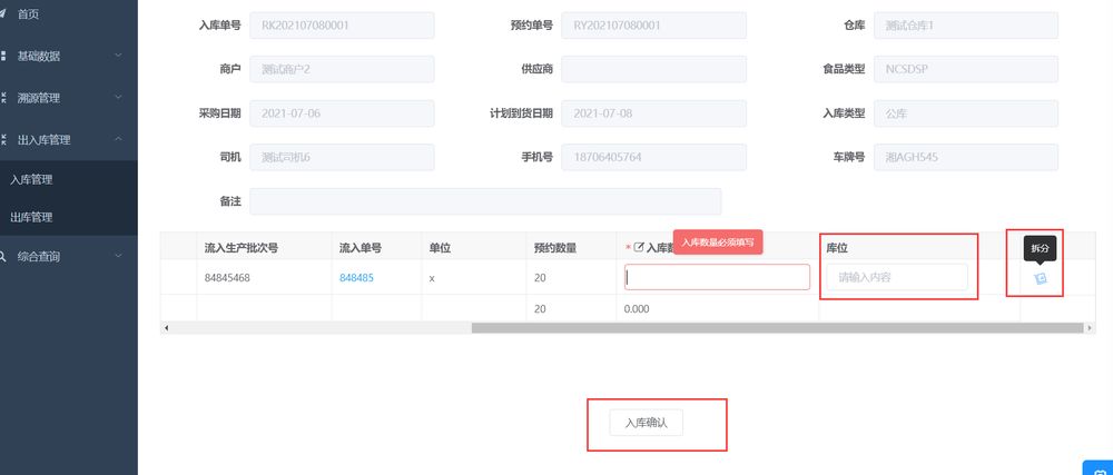 查看待入庫商品詳細信息,選擇要操作入庫的商品,點擊【入庫】按鈕,填寫實際入庫數量和庫位,如需拆分到不同庫位進行儲存,使用拆分功能。入庫數量小于等于預約數量。确認錄入完成,點擊入庫确認,入庫成功。