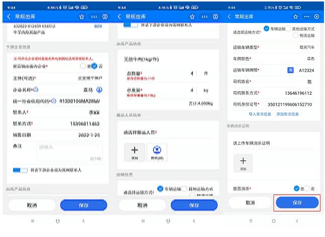 第三步: 出庫的産品掃碼完成後, 填寫下遊企業信息、出庫産品信息、運輸信息(可在主體登記-常用運輸信息裏進行新增)、選擇搬運人員和上傳車輛消殺證明;