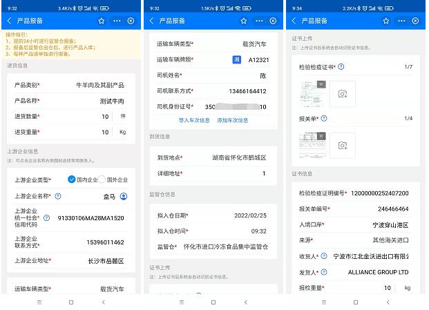 第三步:填寫進貨信息、上遊企業信息、運輸信息、到貨地址、監管倉信息、證書信息、上傳檢疫證書、報關單;