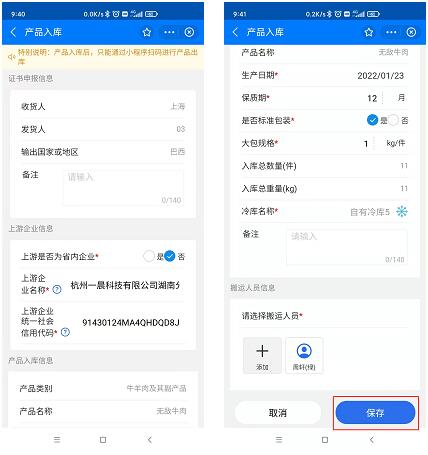 第七步:填寫上遊企業信息、産品入庫信息、選擇冷庫,搬運人員;注:冷庫信息在小程序-主體登記-常用冷庫裏面新增;搬運人員在小程序-企業人員管理-搬運人員管理中添加;